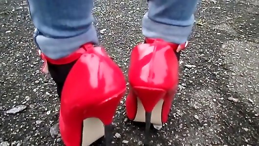 Super-hot Russian blondie crushing locust under acute red leather high high-heeled shoes.